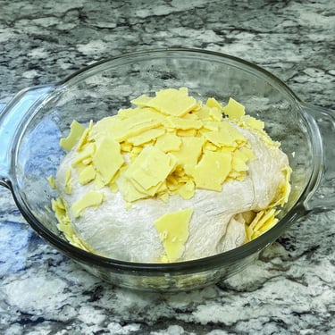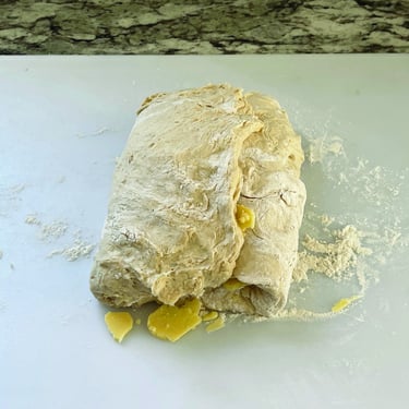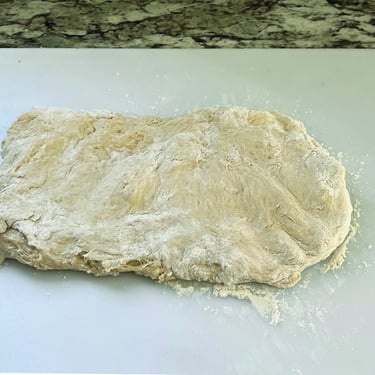 7 Sprinkle work surface with 1 tbsp flour. Scrape dough out, sprinkle both sides with flour, pat into a 10” x 8” rectangle