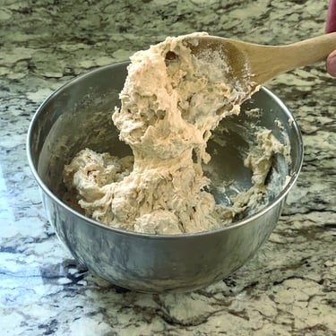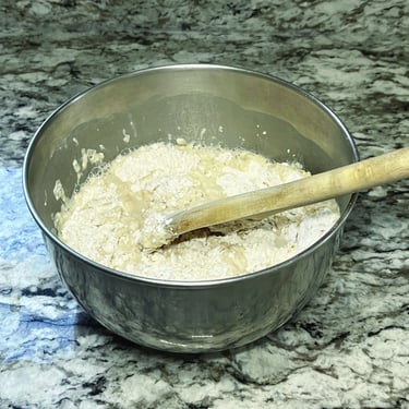 4 Add remaining water, then mix using the handle of the spatula until you can no longer see flour. The dough should not be too sticky to knead by hand